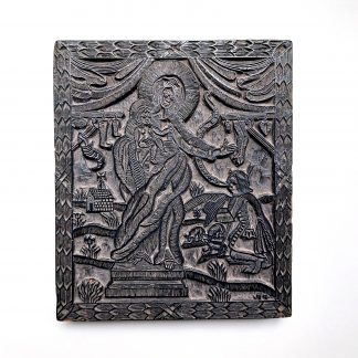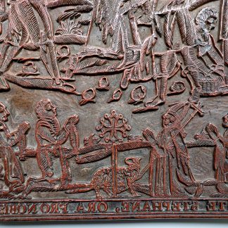 2 800€Grande et belle matrice xylographique pour une représentation du martyre de Saint-Etienne, ornée de la croix d’Occitanie.