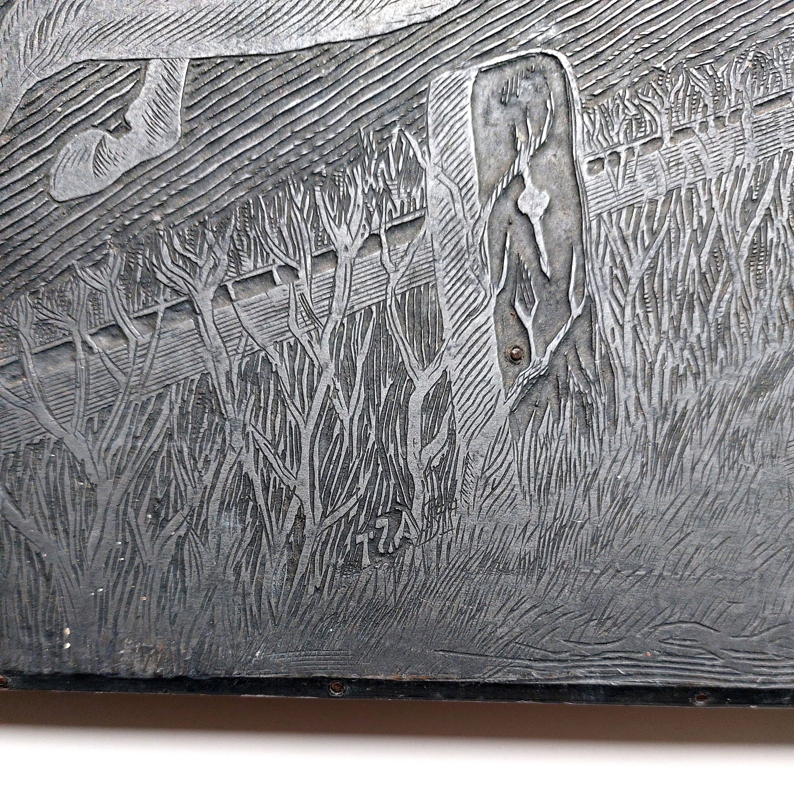 430 x 260 mm, plaque de zinc montée sur bois ; quelques petites rayures.