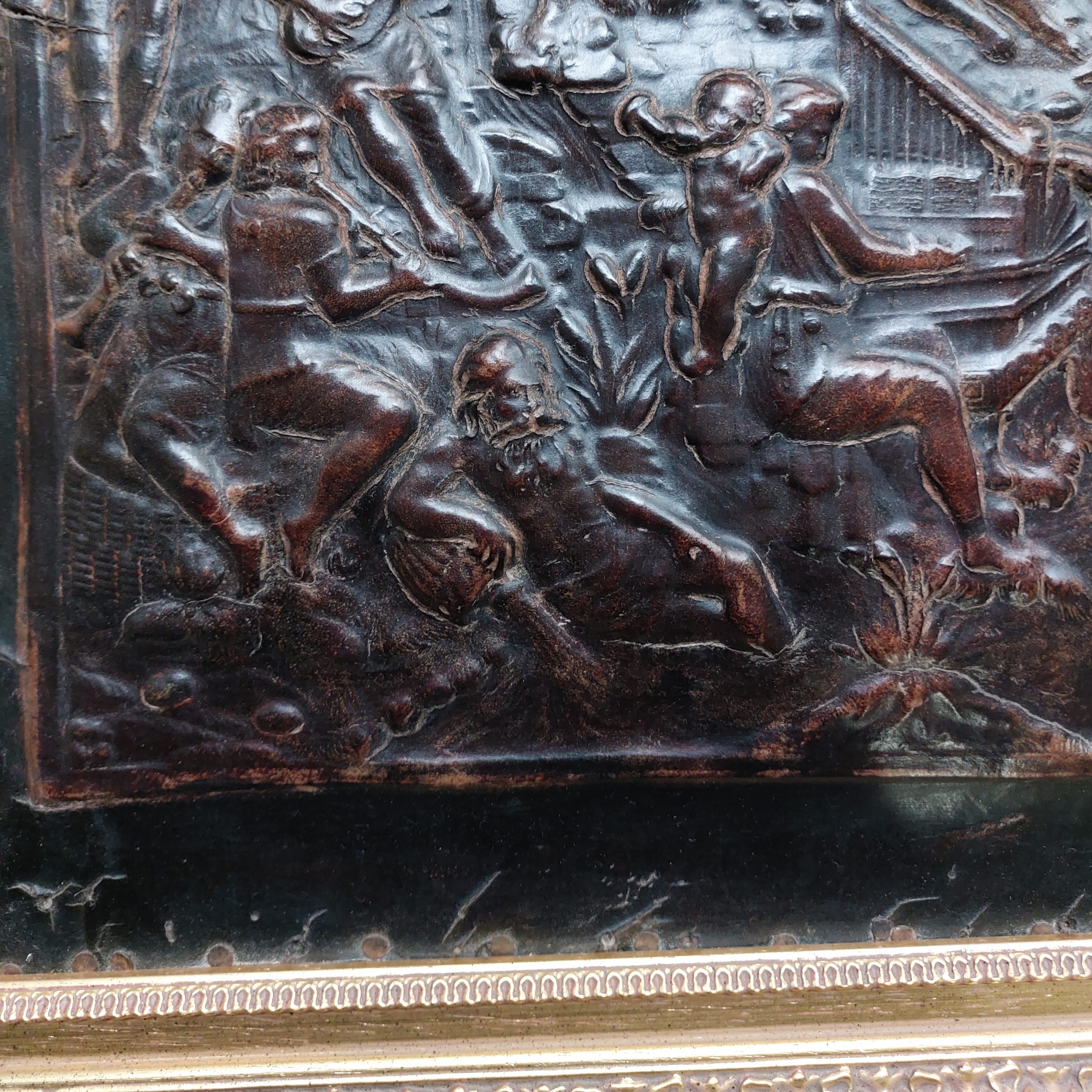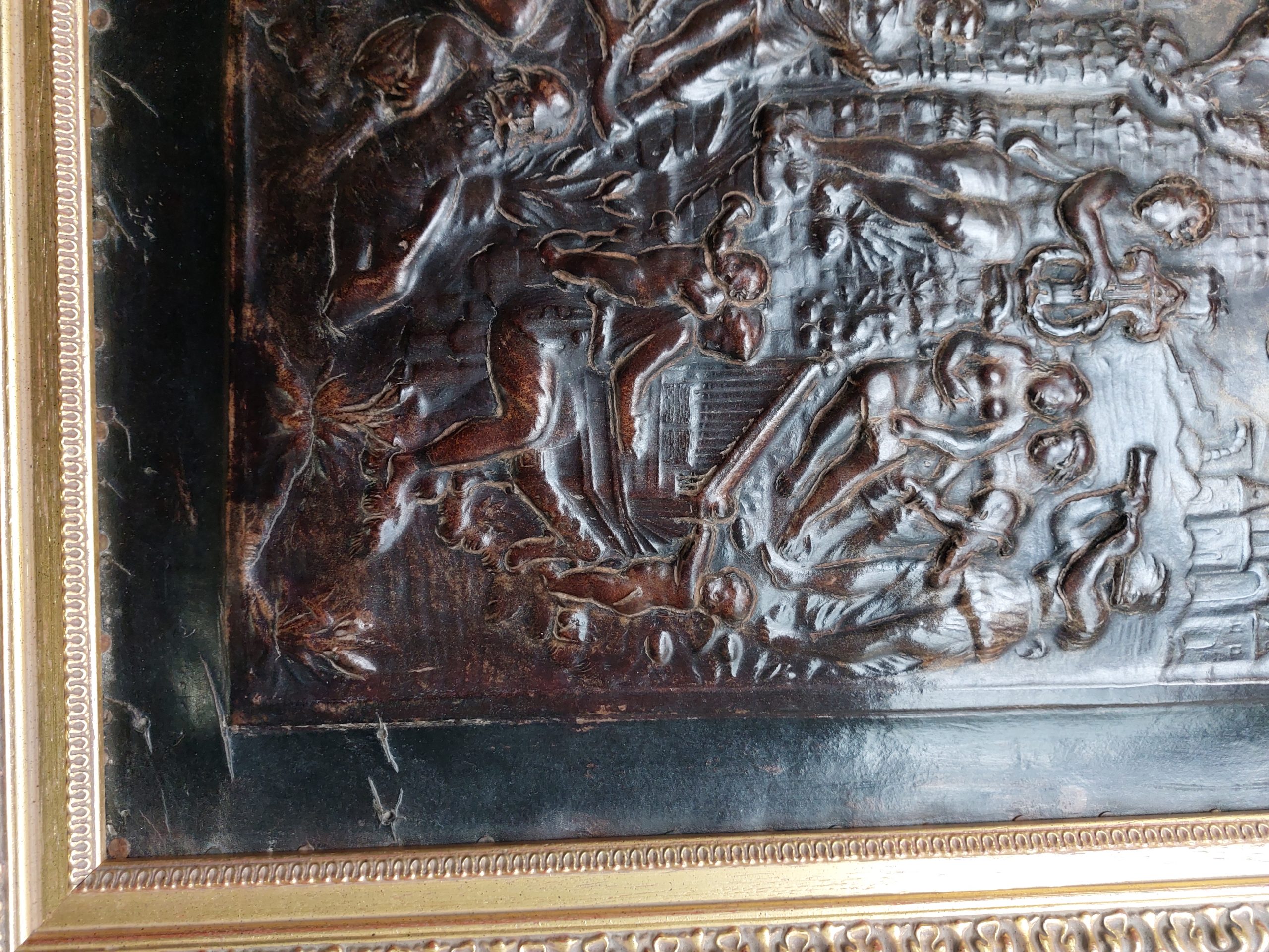 Il pourrait s'agir d'une partie d'un décor mural, les parties de cuir lisses visibles sur les bords de la composition devaient être masquées par le cadre d'origine.
