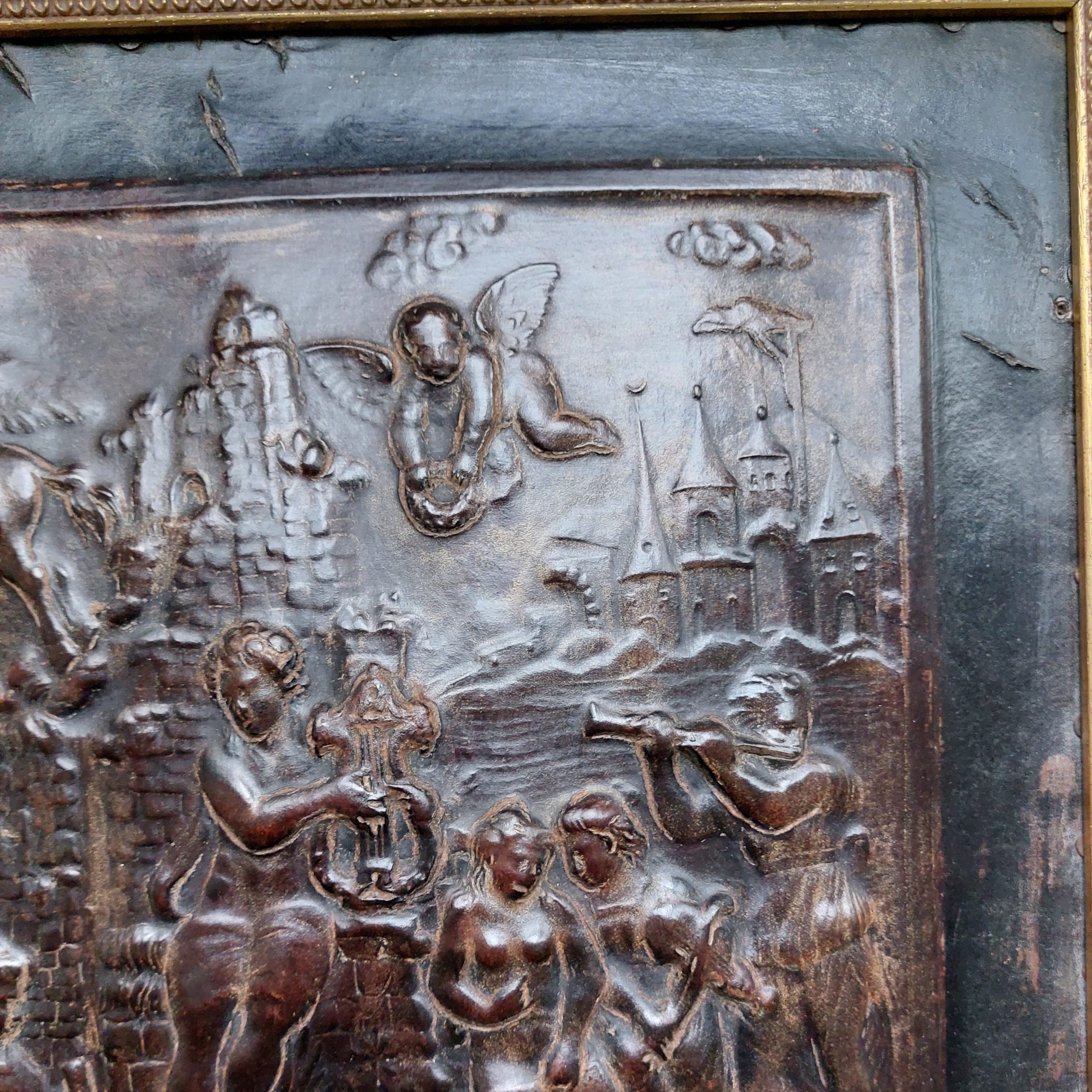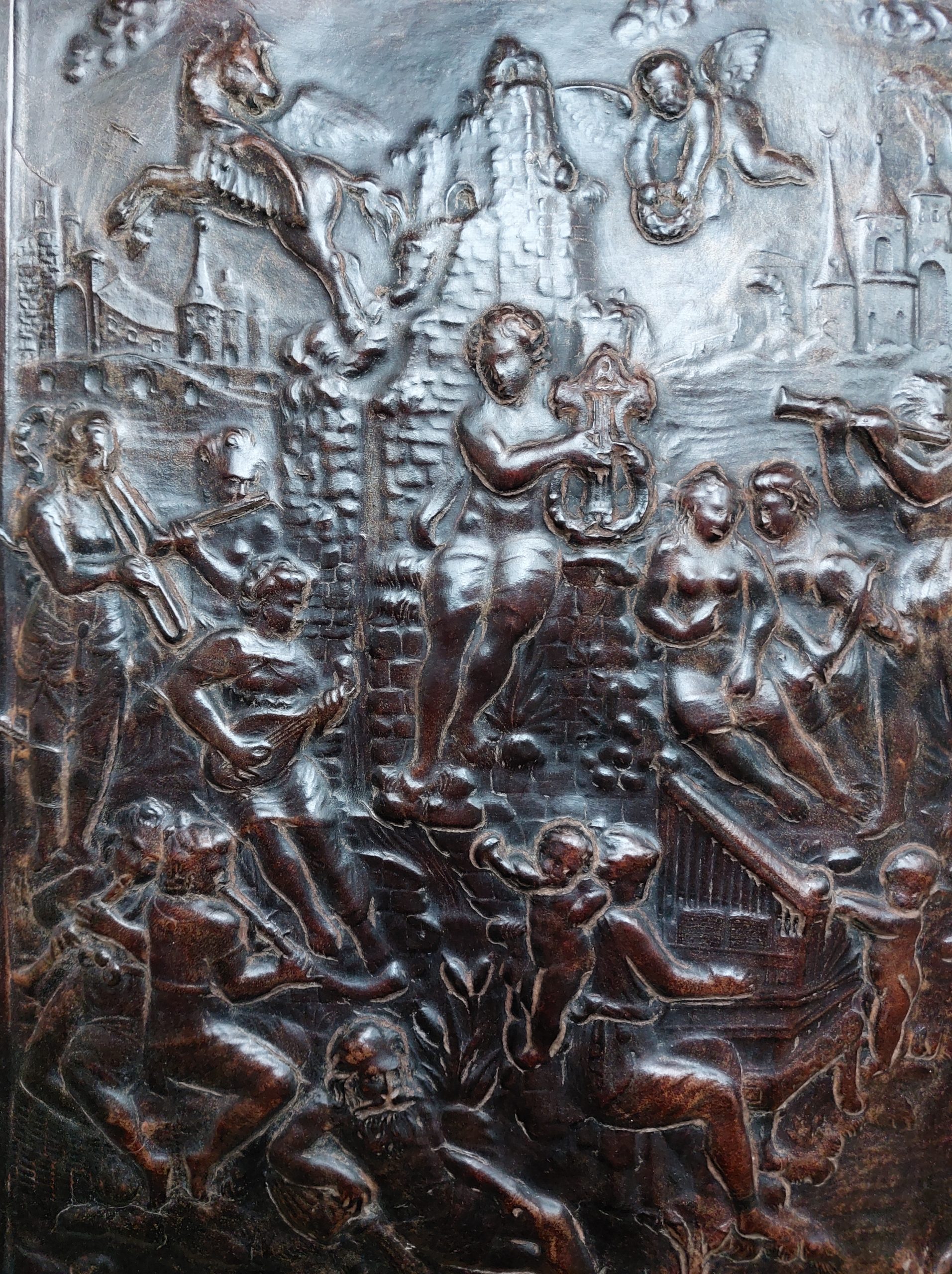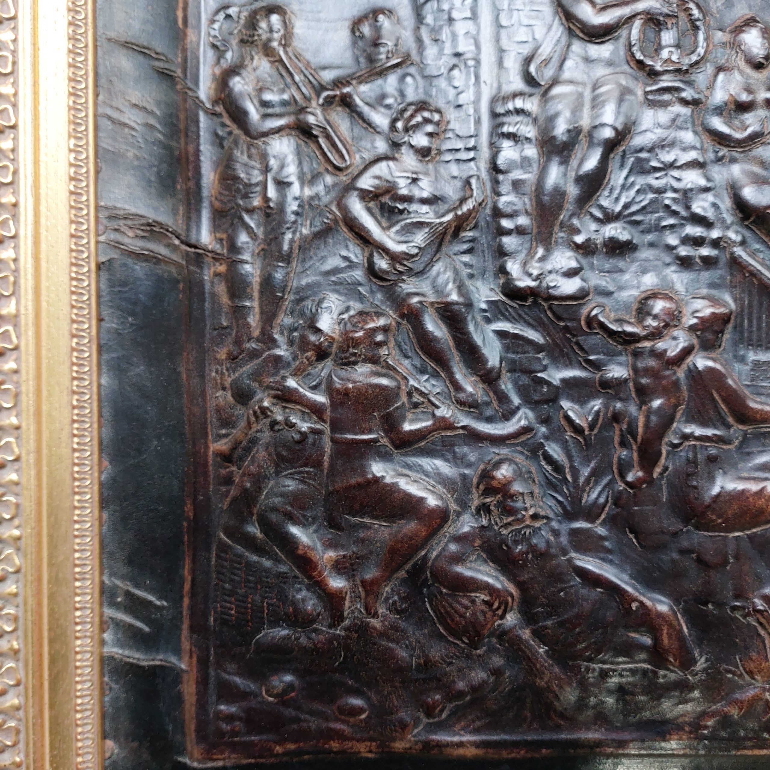 Joli tableau de cuir repoussé allégorique représentant la musique, avec de nombreux musiciens vêtus à l'antique jouant du piano, cuivres, vents, ou cordes. La composition centrale est surmontée d'un pégase et d'un angelot couronnant une joueuse de lyre. Au premier plan se dessine une étendue d'eau, à l'arrière-plan deux compositions architecturales.