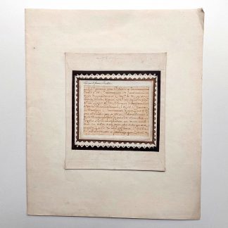 5 petits feuillets (environ 70 x 80 mm), sous montages de papier décoré du XVIIIe siècle (155 x 135 mm), ces derniers à leur tour montés sur un feuillet de papier vergé moderne (270 x 230 mm).