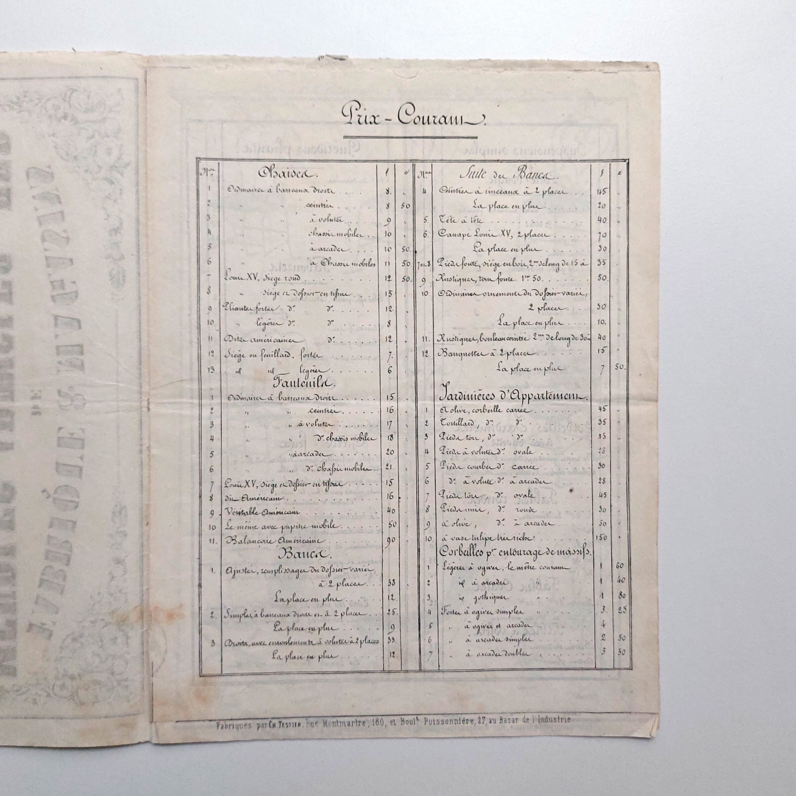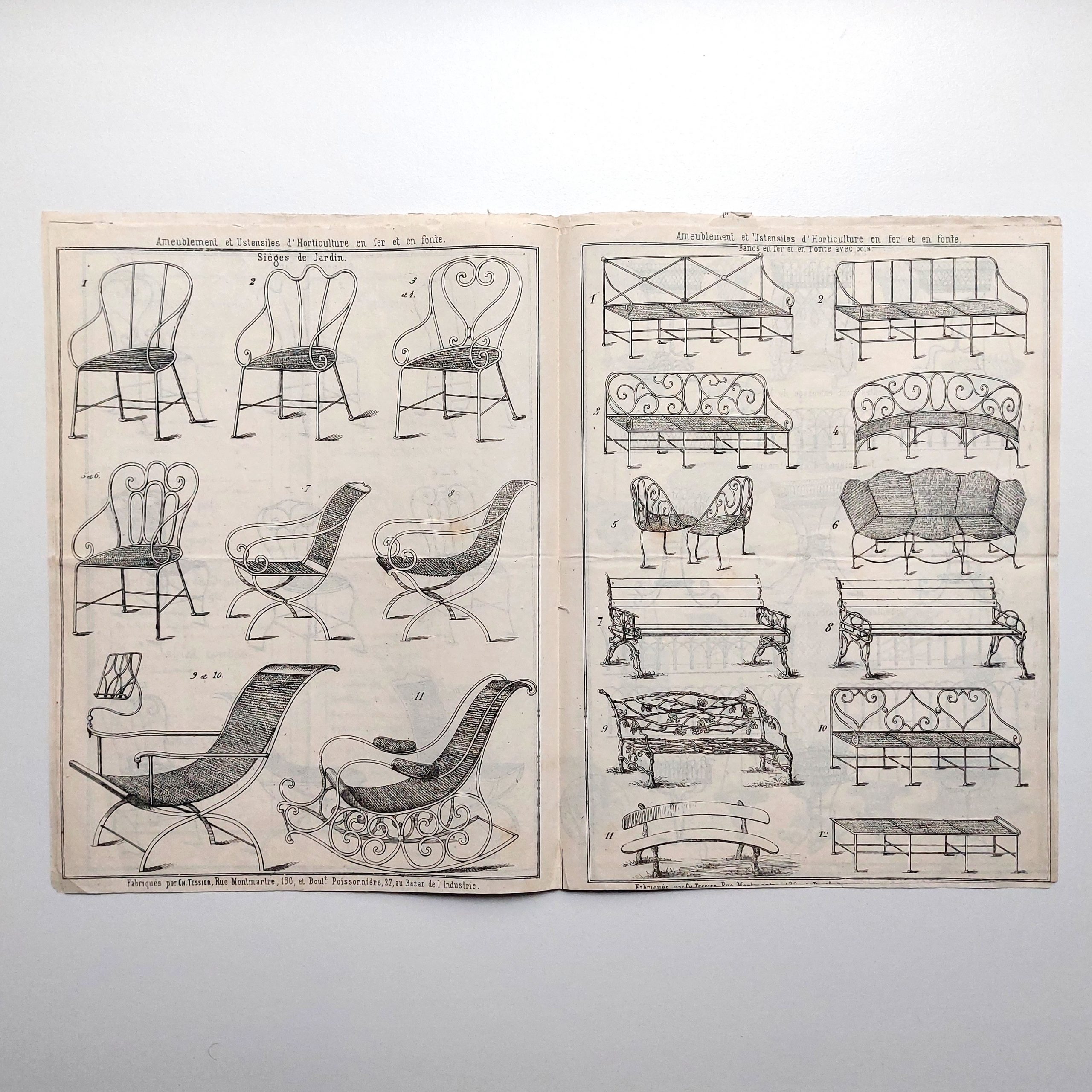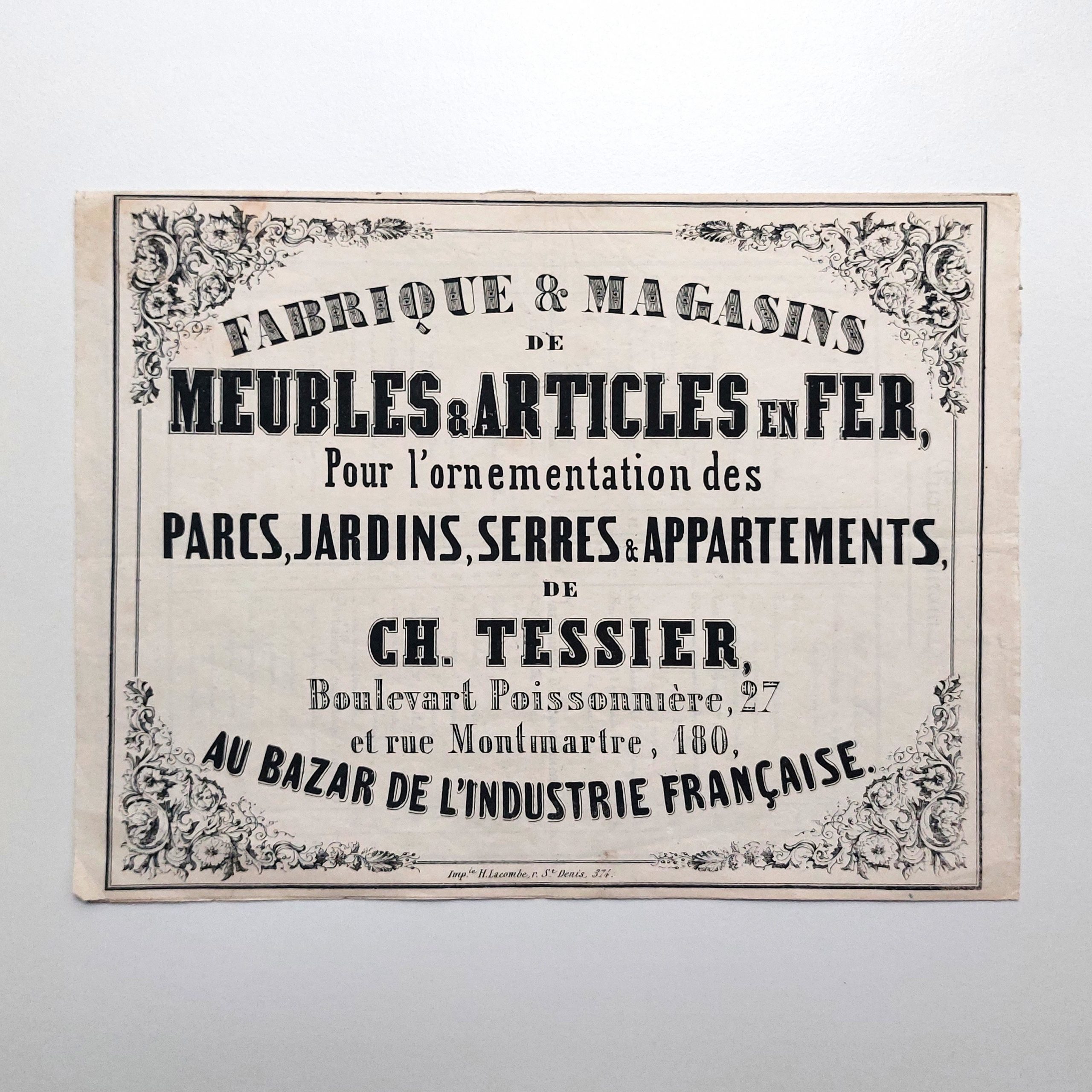 Fabrique & magasins de meubles & articles en fer, pour l’ornement des parcs et jardins, serres & appartements, de Ch. Tessier, Boulevard Poissonnière, 27 et rue Montmartre, 180, au Bazar de l’Industrie française.