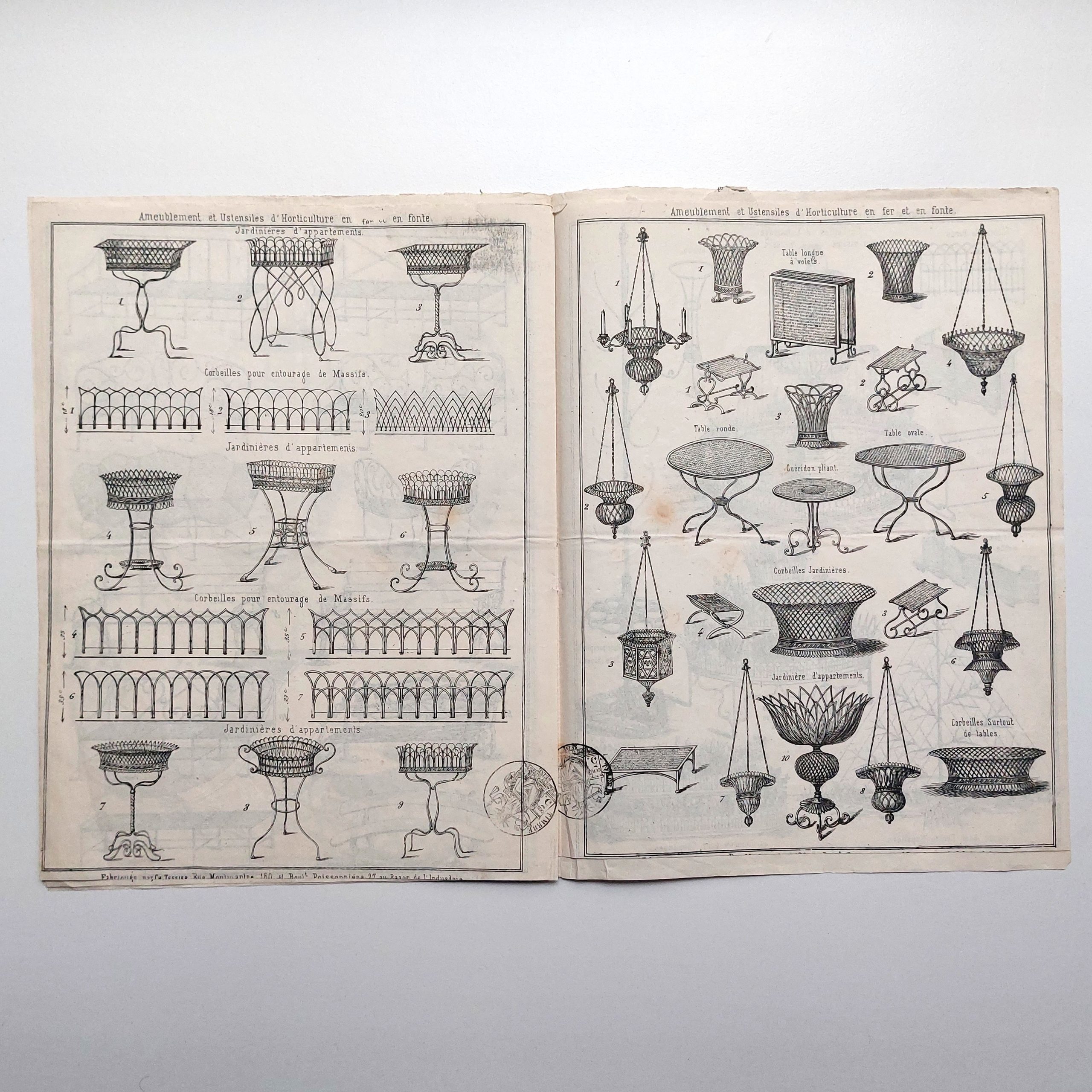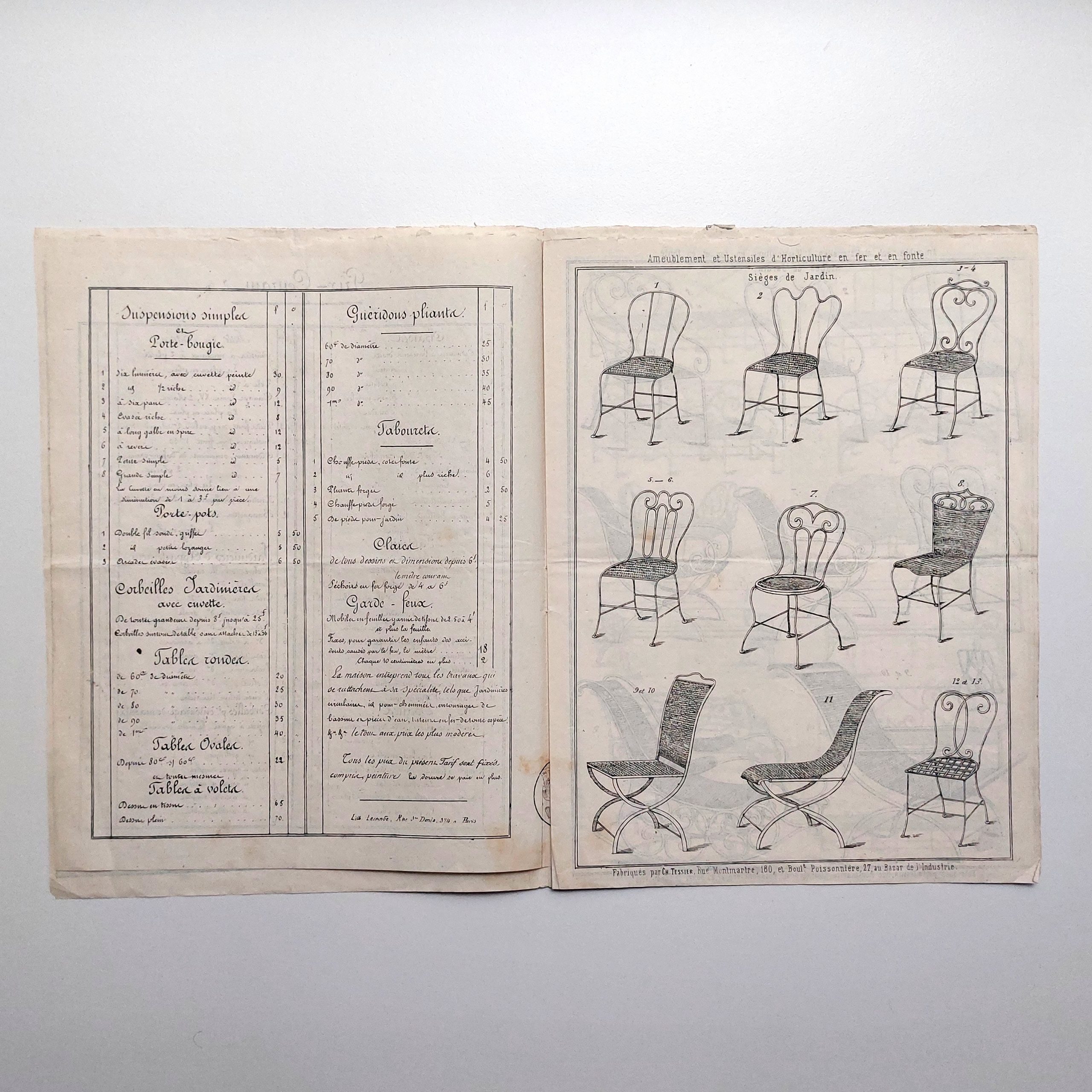 Il présente chaises, fauteuils, bancs, jardinière d'appartement, corbeilles pour entourage de massifs, suspensions simples et porte-bougie, porte-pots, corbeilles jardinières avec cuvette, tables rondes, ovales et à volets, guéridons pliant, tabourets, claies et gardes-feux.