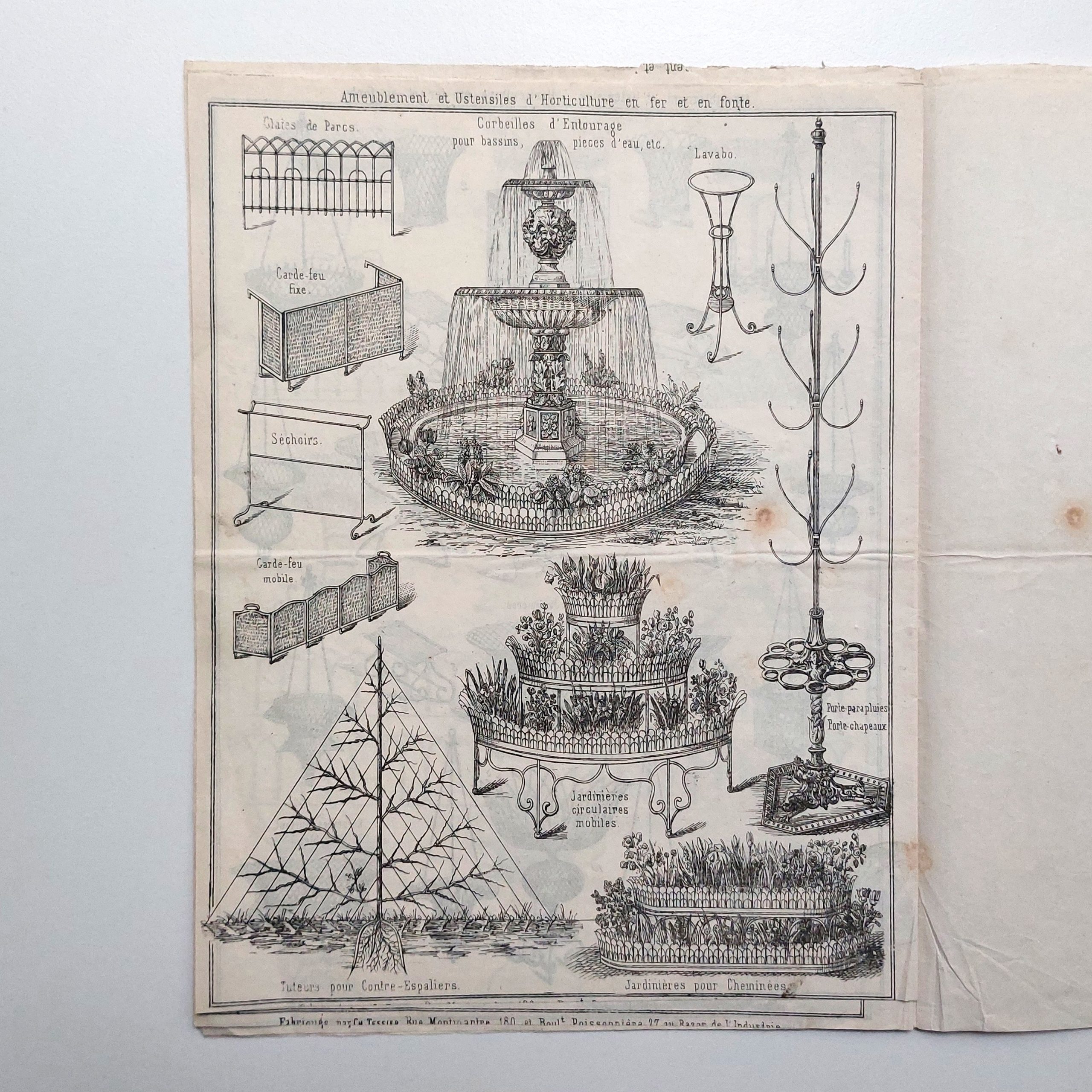 Charmant et rare catalogue commercial ancien, entièrement lithographié, d'ameublements de jardin et ustensiles d'horticulture en fer et fonte.