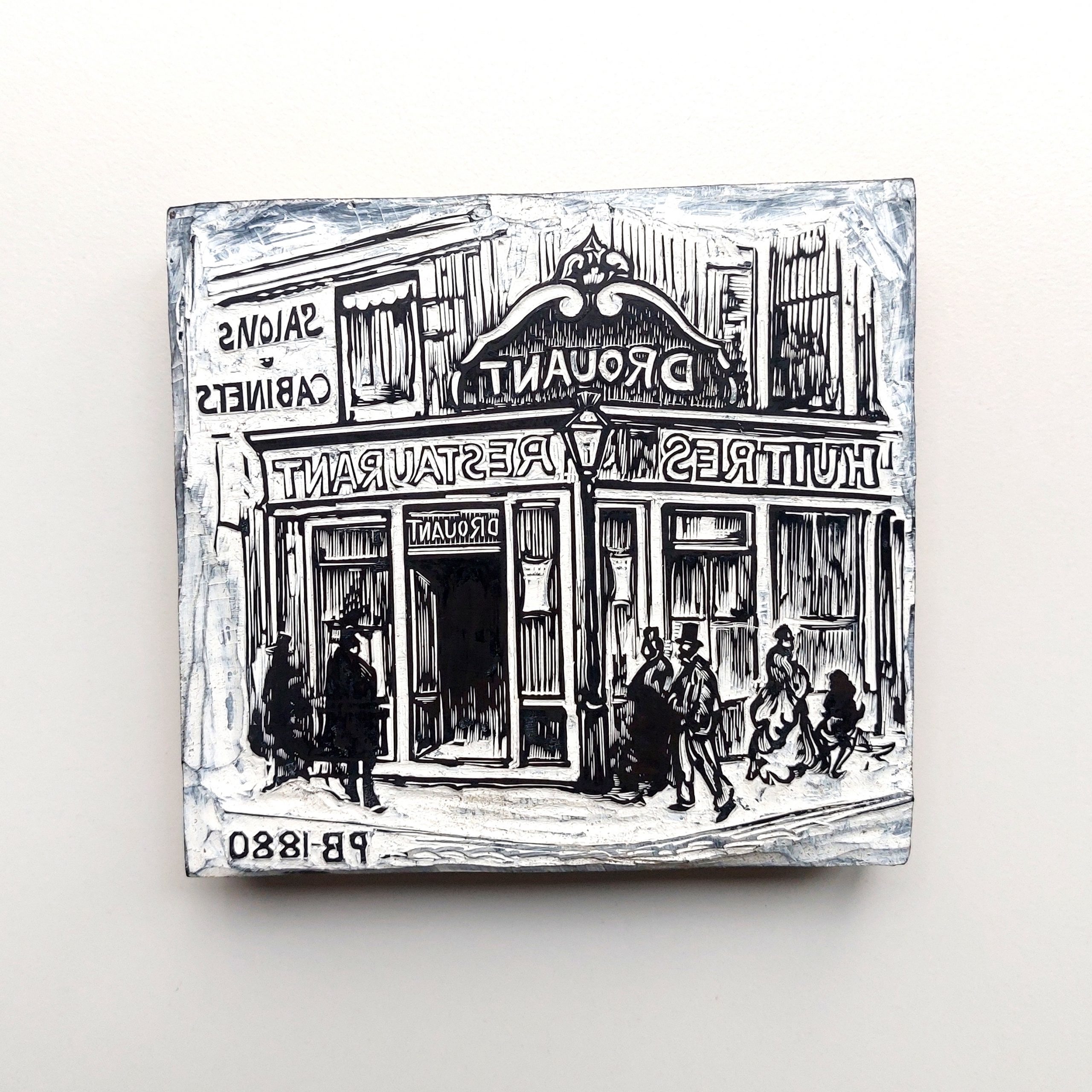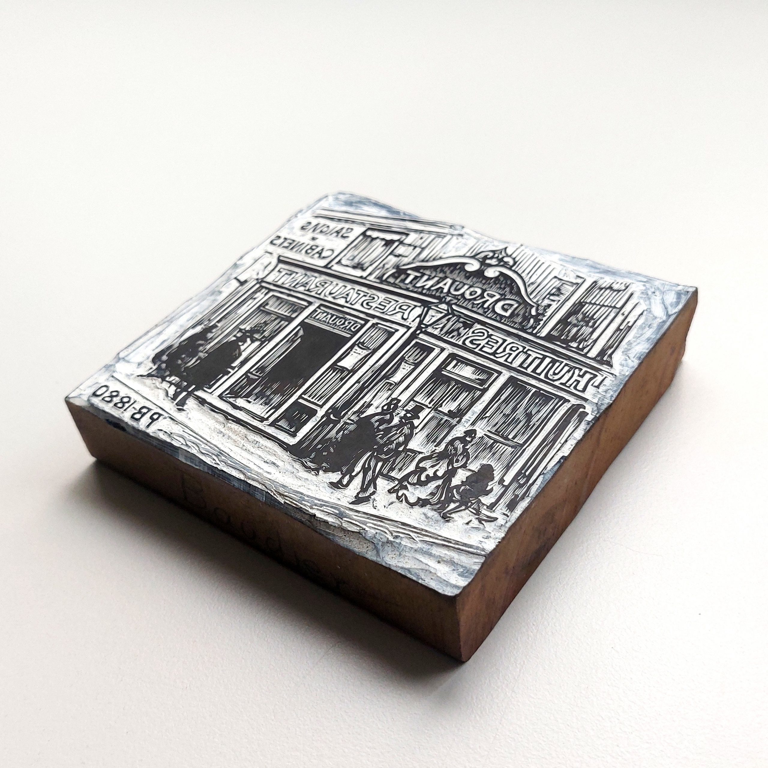 Jolie matrice pour un bois de Paul Baudier représentant le célèbre restaurant Drouant, haut lieux de littérature, accueillant depuis 1914 et 1926 les jurés des prix Goncourt et Renaudot.