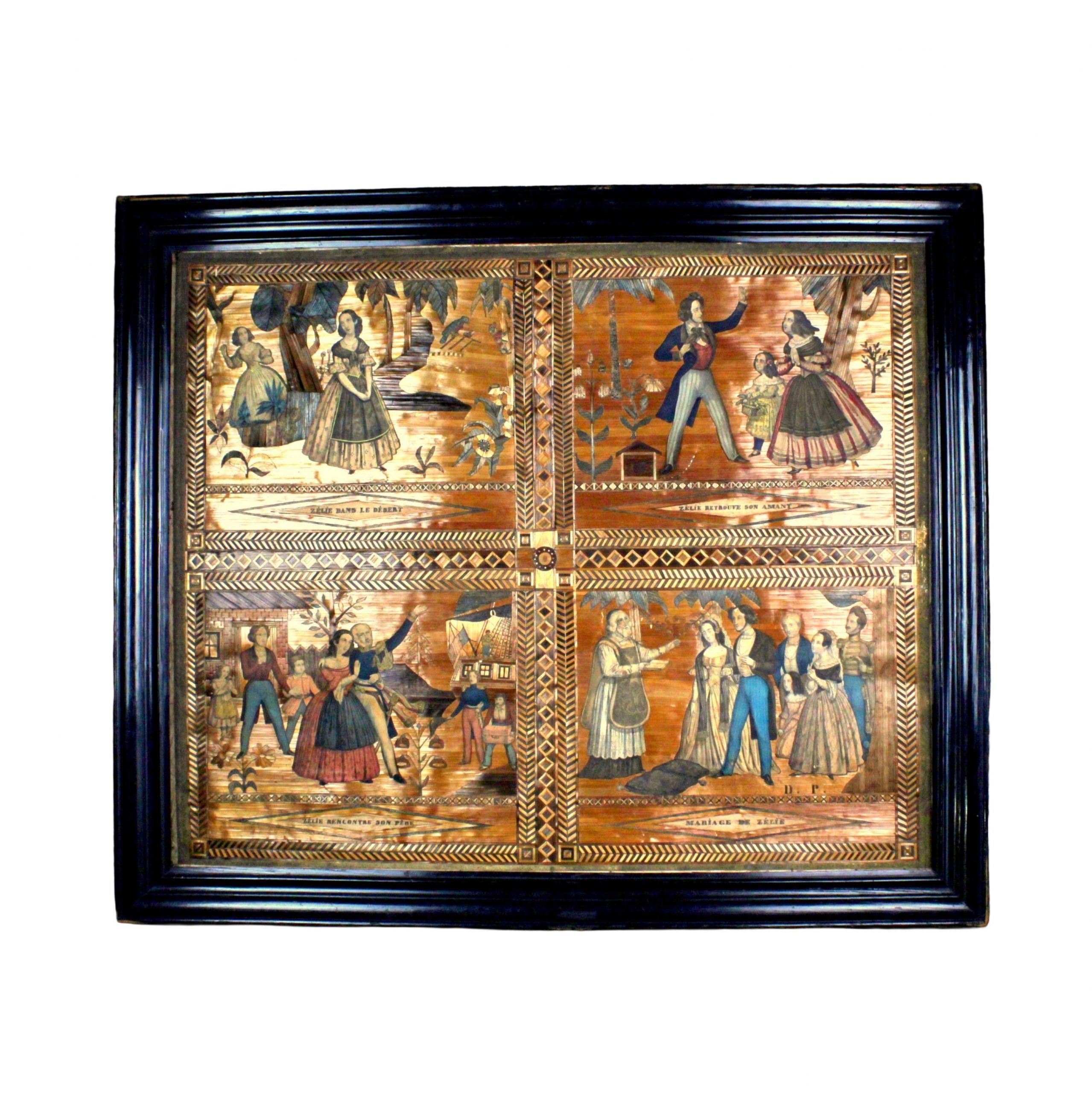 Spectaculaire suite de quatre images d'Épinal découpées et montées sur un riche fond de marqueterie de paille polychrome signé D.P.