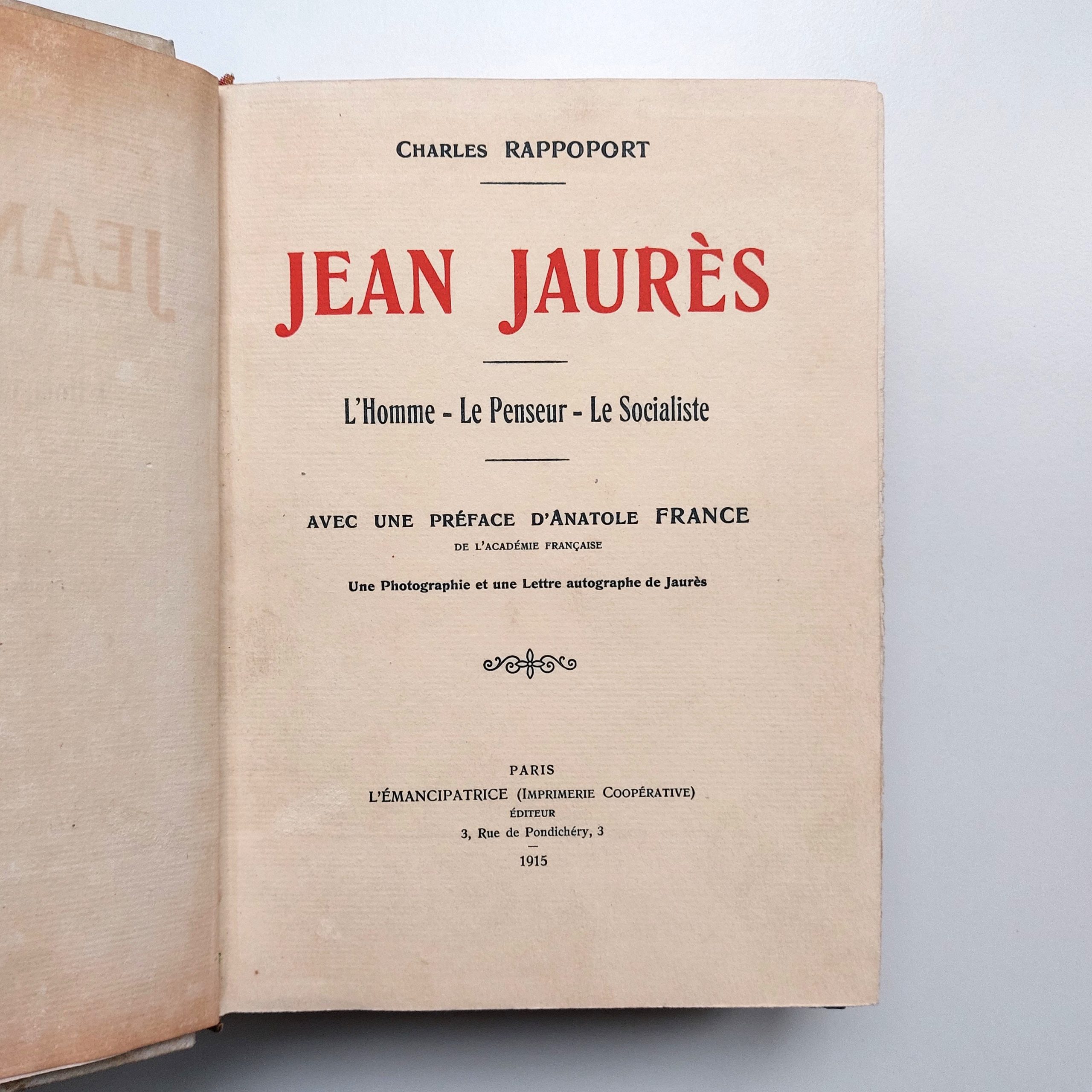 Edition originale de cette biographie de Jean Jaurès par le militant socialiste et communiste d'origine russe Charles Rappoport. Elle est illustrée d'une photographie de Jaurès en frontispice, et d'une lettre en fac-similé.