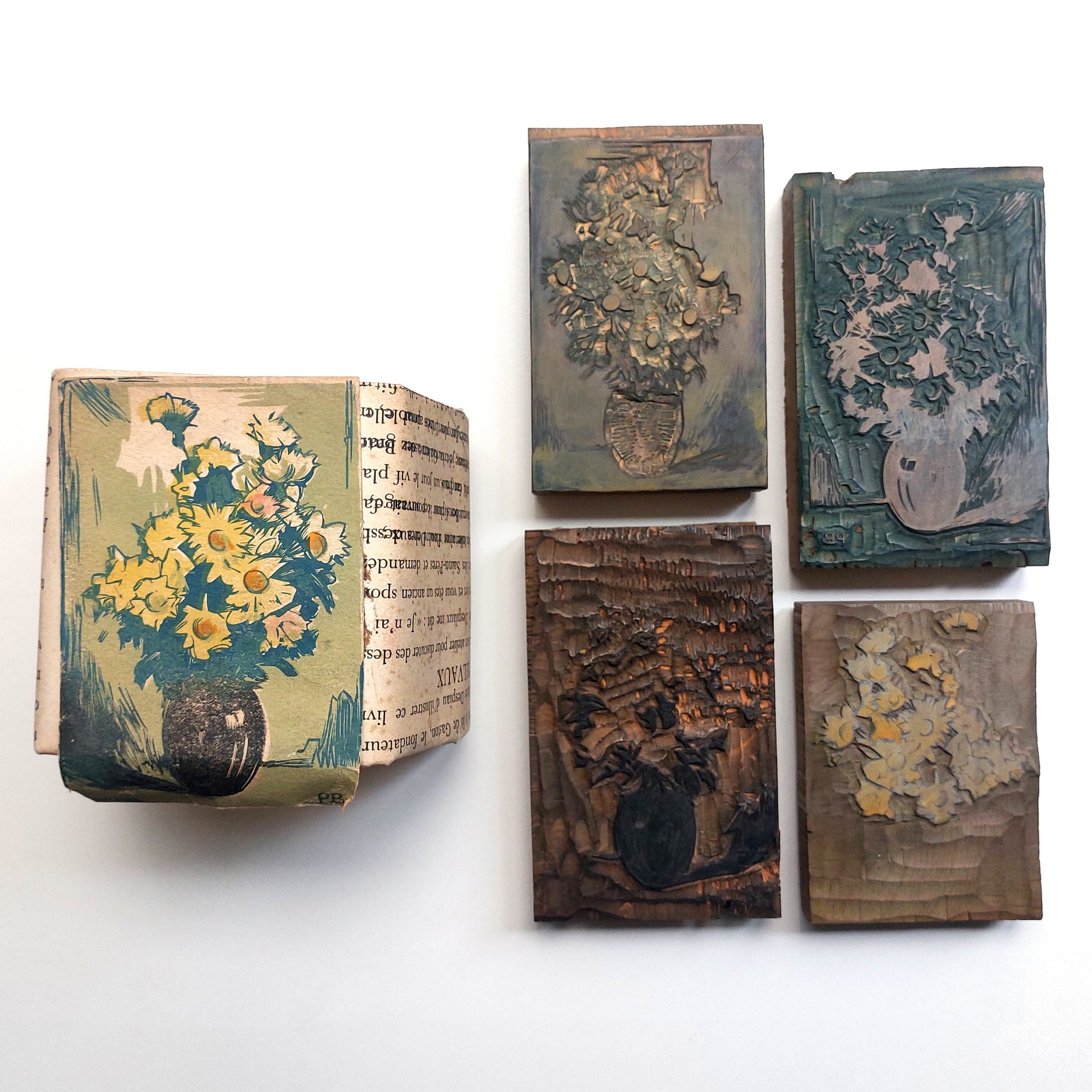 Ensemble de 4 matrices pour le tirage d’un bouquet de fleurs en trois couleurs de Paul Baudier.