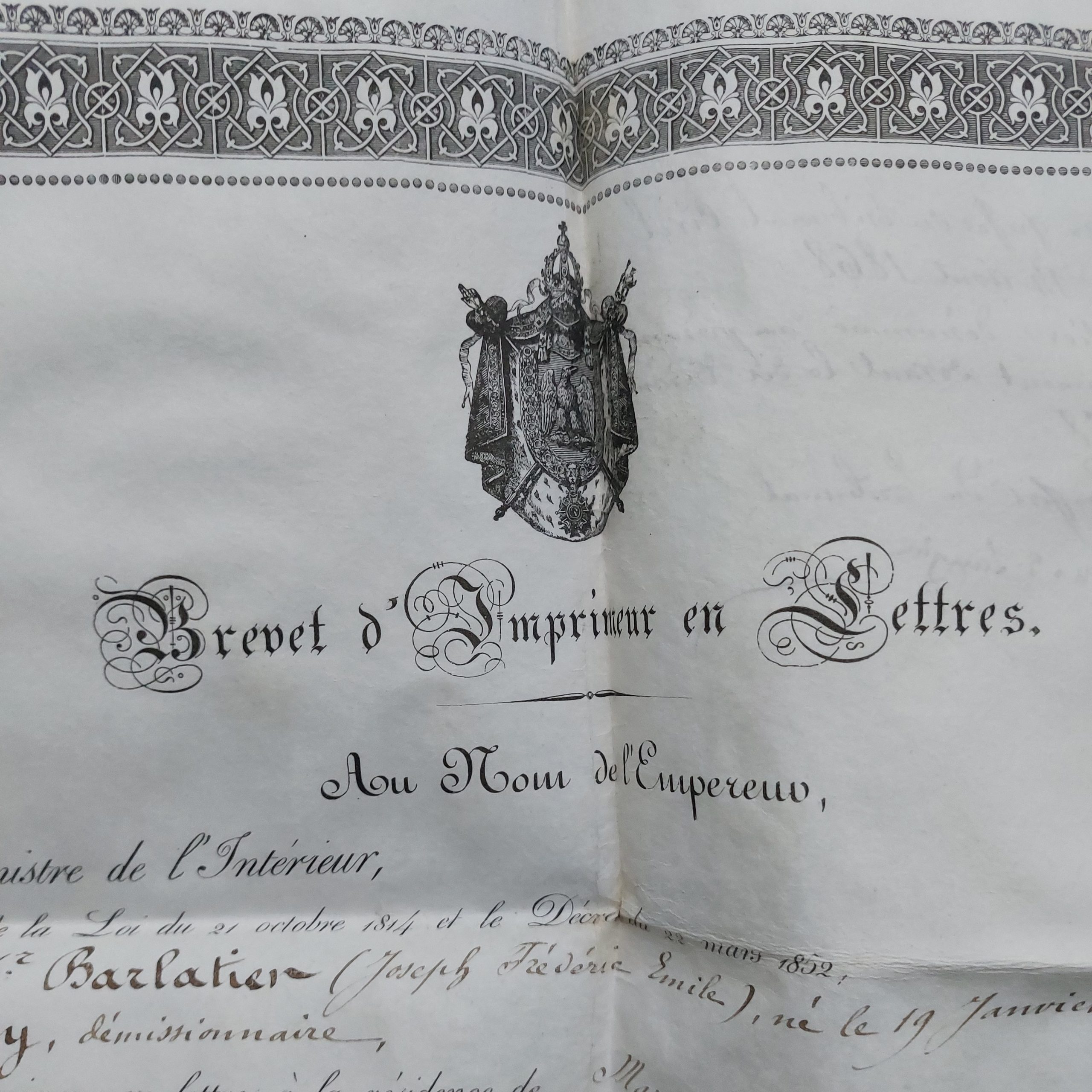 Rare brevet d'imprimeur en lettres, que l'on rencontre semble-t-il moins souvent que ceux d'imprimeur-lithographe ou de libraire.